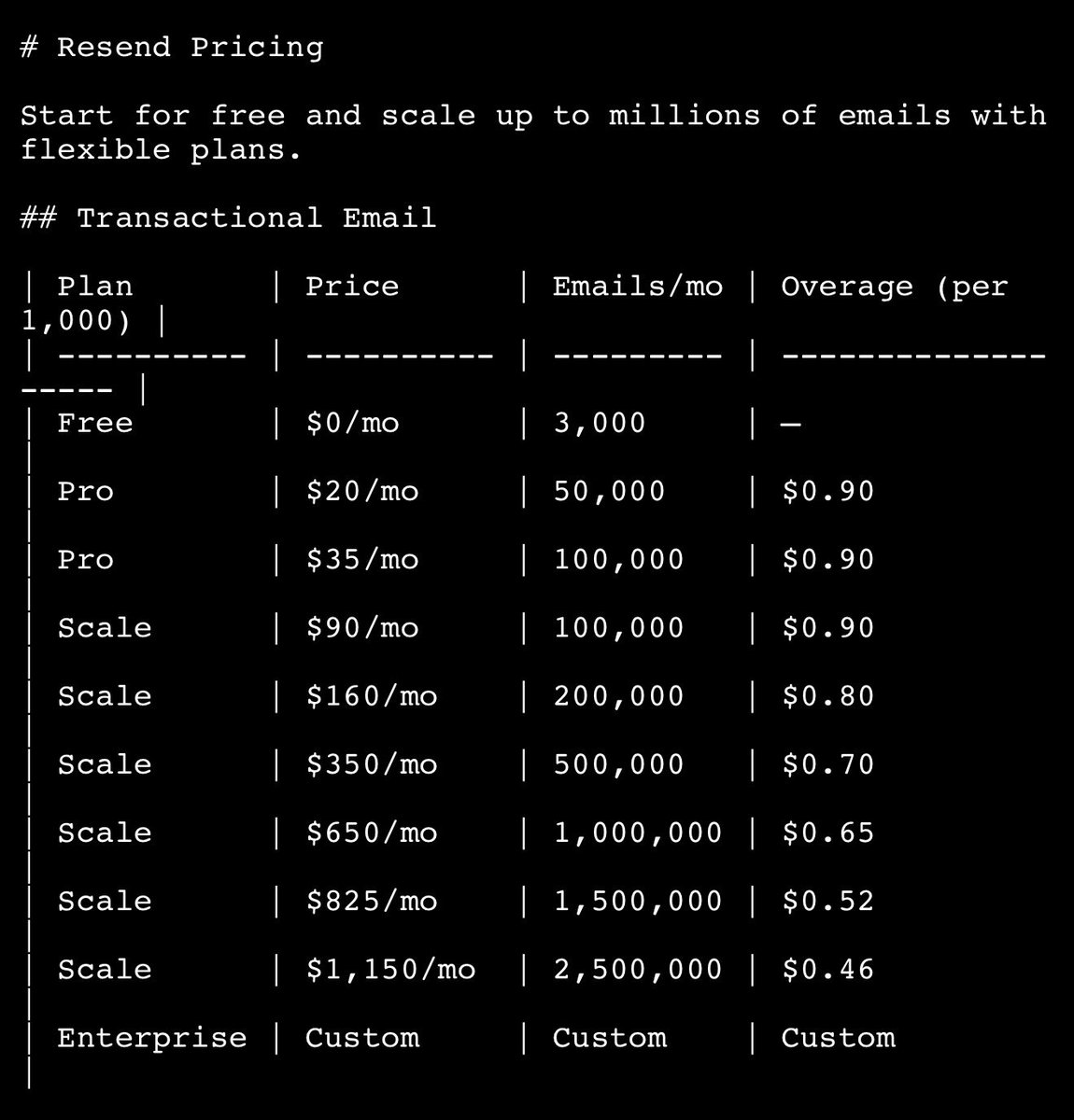 Agents were getting confused by our pricing. Turns out JS-based sliders are not the best way for them to parse things. So today I’m shipping https://resend.com/pricing.md Plus, content negotiation (Accept: text/markdown). Pricing is now machine-readable for AI agents and LLMs.