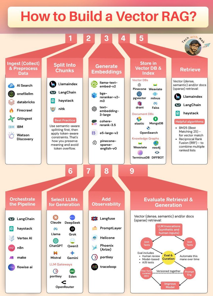 RAG ≠ “just embeddings + GPT.” It’s a 9-step system: Ingest → Chunk → Embed → Index → Retrieve (Hybrid) → Orchestrate → Generate → Observe → Evaluate Dense + BM25 + Rerank > single search. Observability > guesswork. System thinking wins. 🧠 Credit: Tech with Mak #RAG #AI #LLM #VectorDB