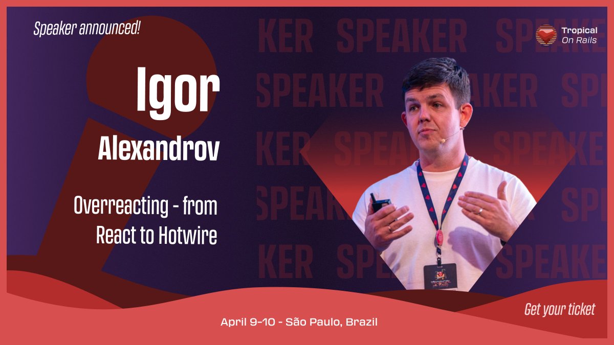 [ENG] @igor_alexandrov at Tropical on Rails 2026! Co-founder and CTO of JetRockets, Docker Captain, and a Ruby/Rails engineer since 2008, Igor is also an active open-source contributor to projects like Kamal. He'll be presenting "Overreacting – from React to Hotwire." If you've ever wondered whether your app really needs a full JavaScript framework or if Hotwire can do the job, this is the talk for you. Igor will walk through the journey of moving from React to Hotwire and what that shift looks like in practice. 📅 April 9-10 · Pullman Vila Olímpia, São Paulo 🔗 http://tropicalonrails.com [PT-BR] @igor_alexandrov no Tropical on Rails 2026! Co-founder e CTO da JetRockets, Docker Captain e engenheiro Ruby/Rails desde 2008, Igor também é um contribuidor ativo de projetos open-source como o Kamal. Ele vai apresentar "Overreacting – from React to Hotwire." Se você já se perguntou se sua app realmente precisa de um framework JavaScript completo ou se o Hotwire dá conta do recado, essa talk é pra você. Igor vai mostrar a jornada de migração de React para Hotwire e como isso funciona na prática. 📅 09-10 de Abril · Pullman Vila Olímpia, São Paulo 🔗 http://tropicalonrails.com #TropicalOnRails #RubyOnRails #RubyCommunity #TechConference